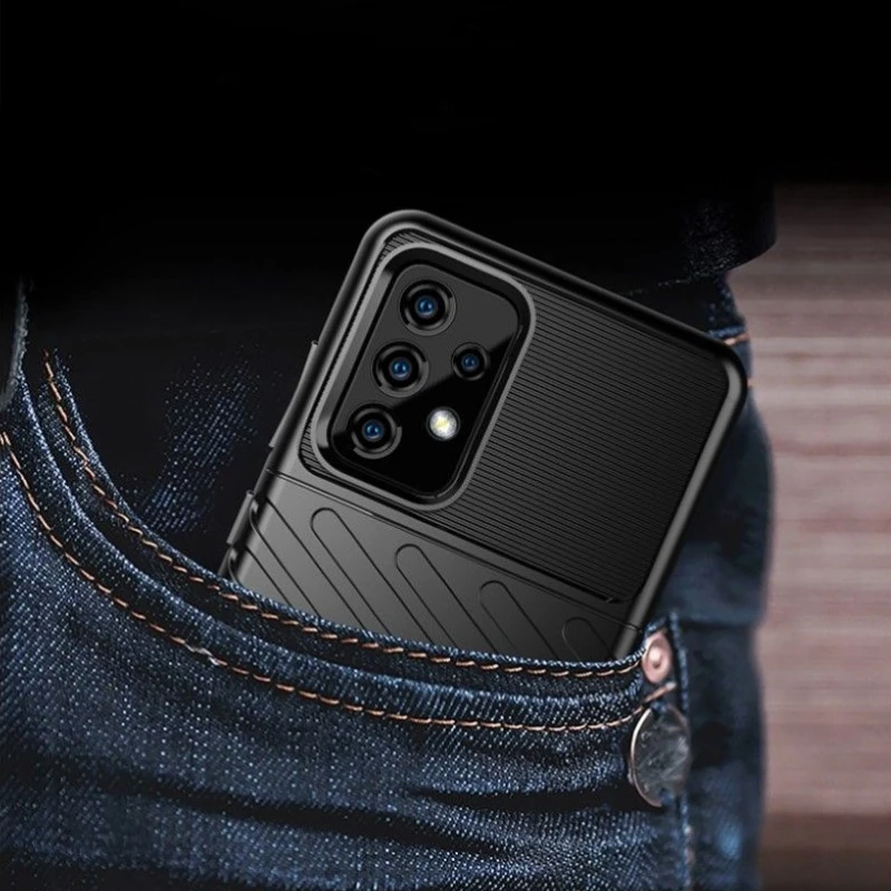 God beskyttende tpu cover til Samsung Galaxy A52 (4G/5G) A52S med overflade som ligner børstet metal og carbon. Siderne er ekstra tykke for at opnå maksimal all round beskyttelse mod stød og slag, rundt om kameraet og fingeraftrykslæseren er tpu rammen tykkere for at give bedre beskyttelse til li..