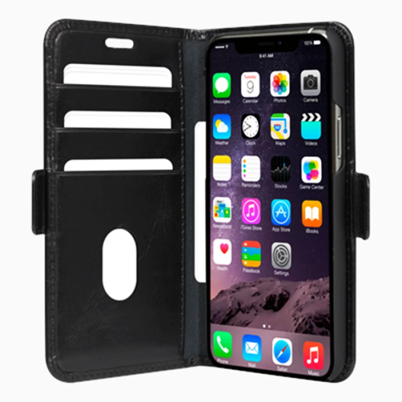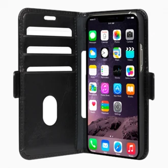 Du får her et mobilcover til din iPhone 11 Pro i klassisk business stil med praktiske lommer. Der er 3 lommer til kredit kort og en lomme til sedler. Der er lavet hul til højtaleren så du kan snakke i telefonen med coveret lukket, og desuden så kan den foldes så telefonen kan stå selv. Pu læderet..