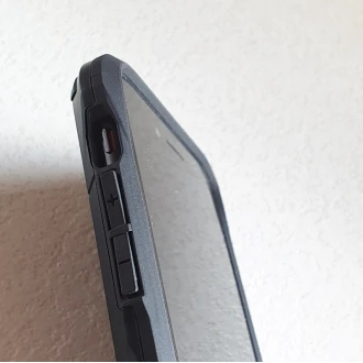 Overfladen er designet så du får et rigtig godt greb om telefonen og der er ekstra tyk tpu i hjørner for optimal stød beskyttelse. Coveret er lidt højere end skærmen i siderne for også at give den noget beskyttelse, og den har en stander der kan foldes ud, så telefonen kan stå selv.