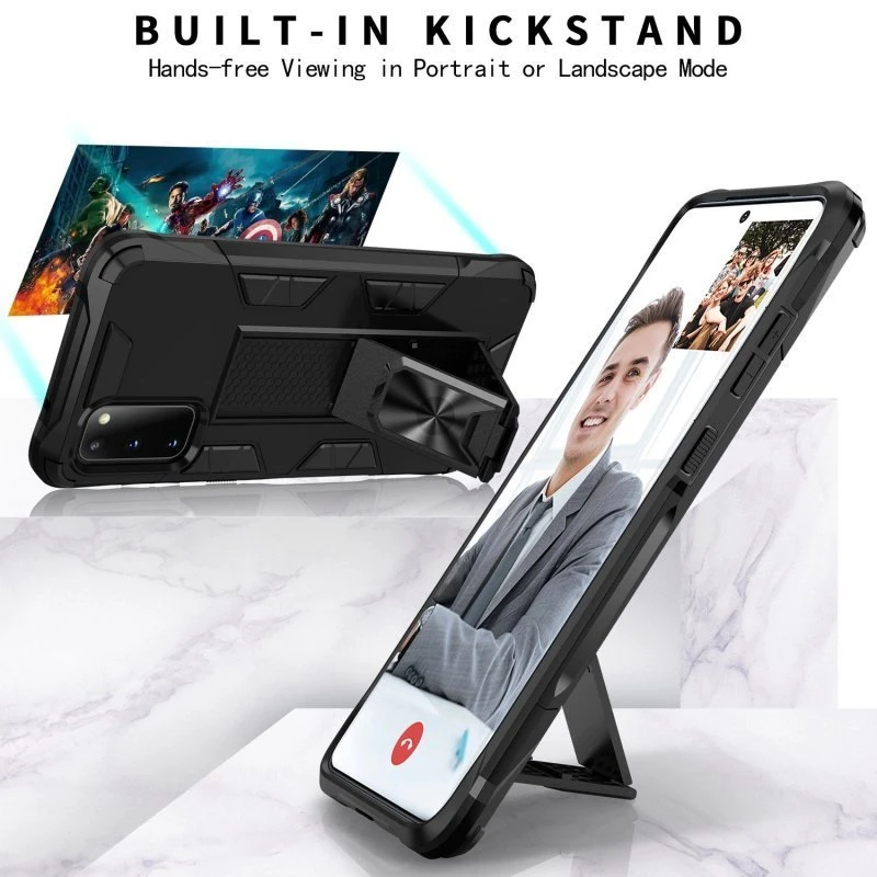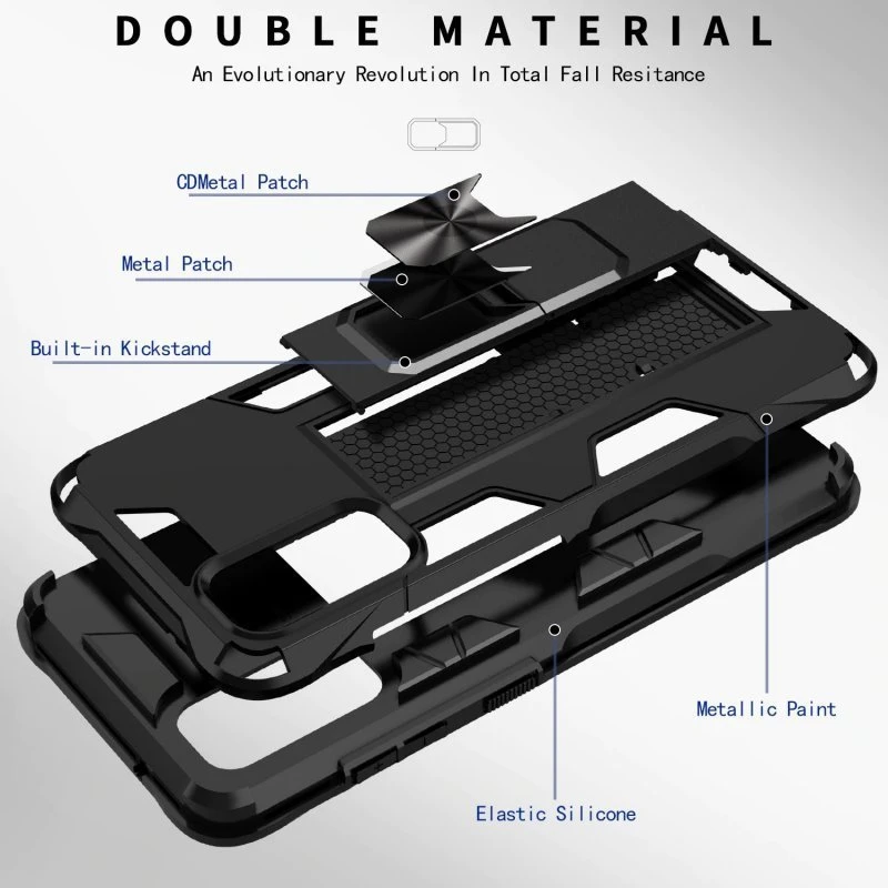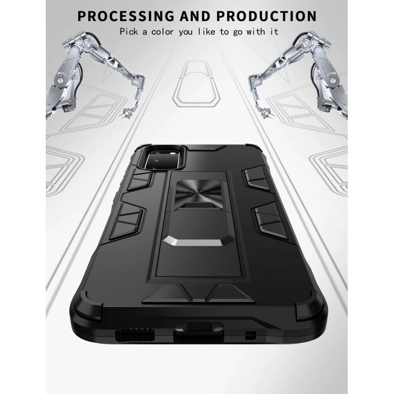 Overfladen er designet så du får et rigtig godt greb om telefonen og der er ekstra tyk tpu i hjørner for optimal stød beskyttelse. Coveret er lidt højere end skærmen i siderne for også at give den noget beskyttelse, og den har en stander der kan foldes ud, så telefonen kan stå selv.