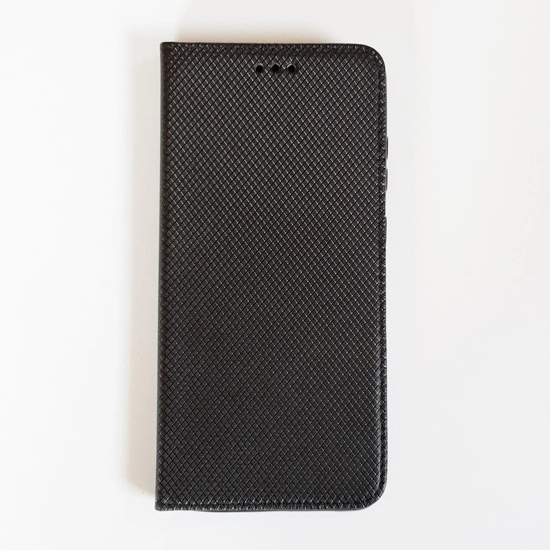Der er lavet hul ved højtaleren så du kan snakke i telefonen med etuiet lukket. Etuiet kan foldes så telefonen kan stå selv når du skal se film eller lignende. Den holdes lukket med en magnet som er skjult i front klappen.