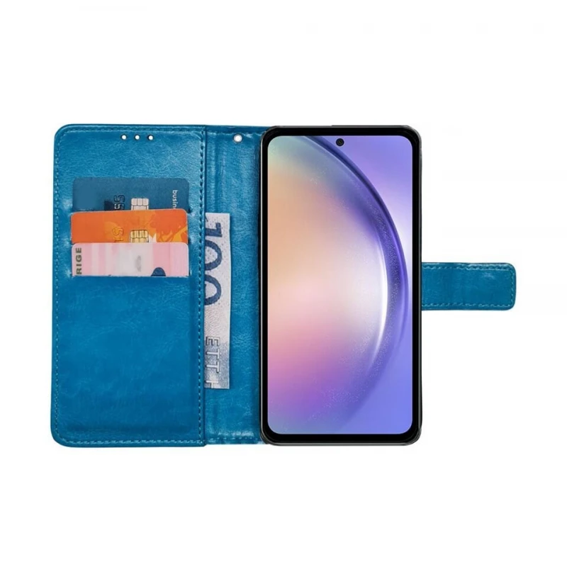 Du får her en god beskyttende flip cover til din Samsung A54 5G med praktiske lommer. Der er 3 lommer til kredit kort hvor den ene kan bruges til ID kort og en lomme til sedler. Coveret kan foldes så telefonen kan stå selv når du skal se video osv. Lavet af ekstra kraftig læder med blød overflade..