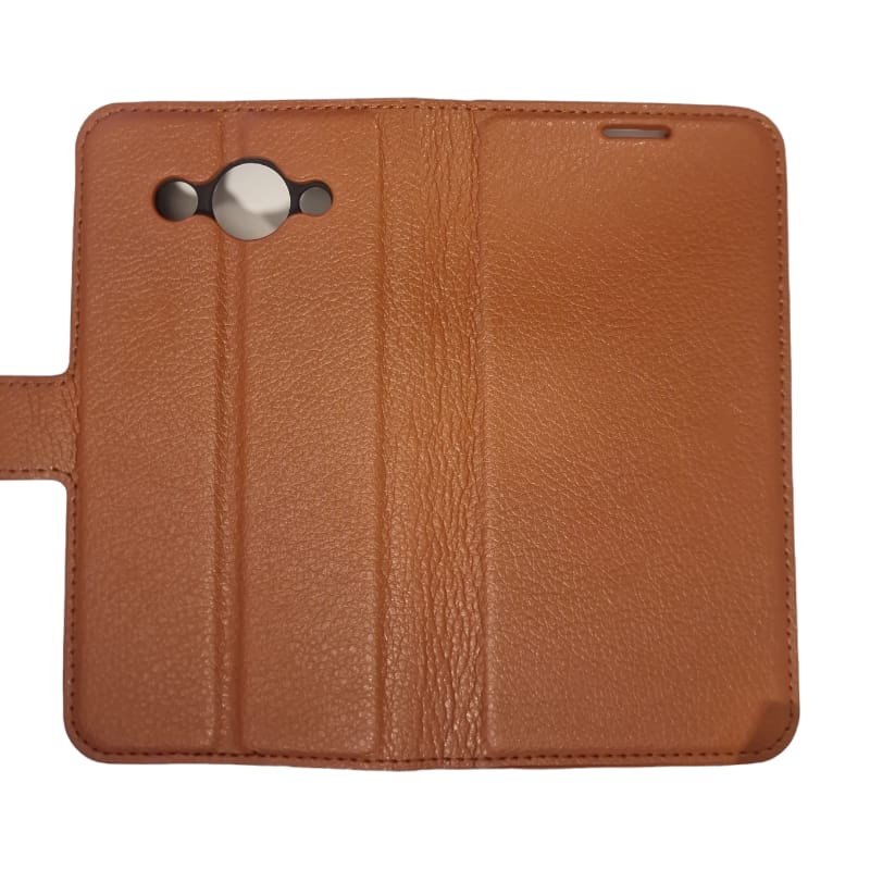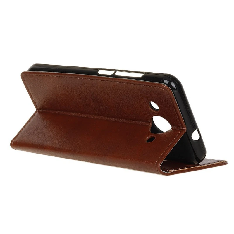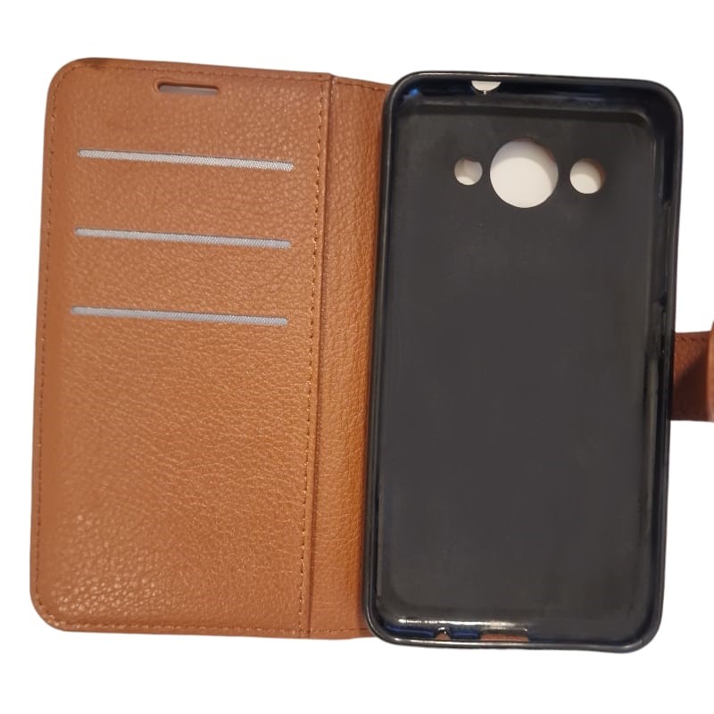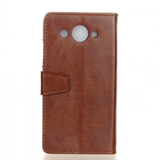 God beskyttende klassisk flip cover med praktiske lommer, brun Med lommer til 2 kredit kort og en lomme til sedler, og der er lavet hul til højtaleren så du kan snakke i telefonen med coveret lukket. Coveret kan foldes så telefonen kan stå selv. R..