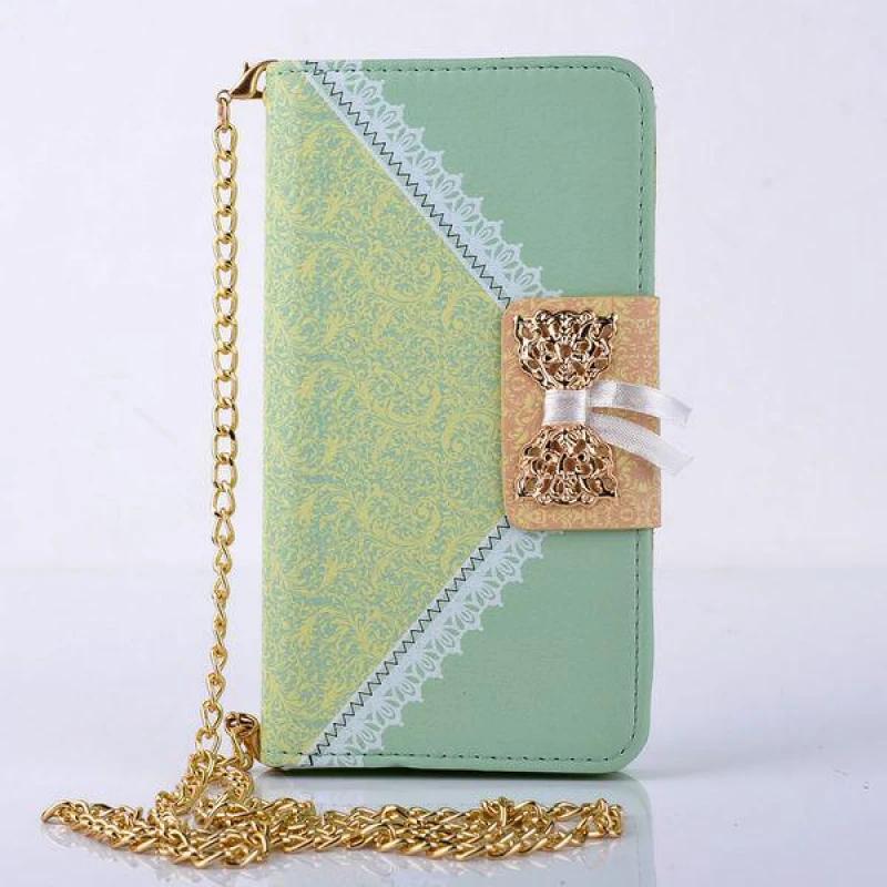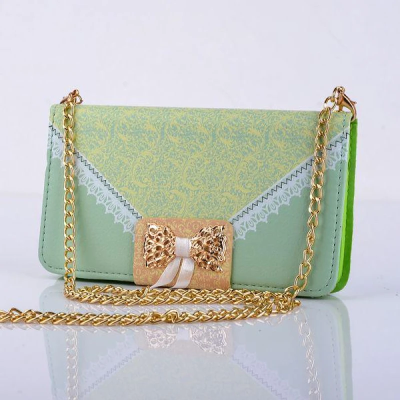 Et fiks læder pung cover med kæde så den kan bruges som en lille taske -Farve: lilla -med et smart mønster -med magnetisk lukkefunktion som holder coveret sikkert lukket -med flip stand så telefonen kan stå selv (praktisk når du skal se film eller høre musik) -Med indvendige lommer så..