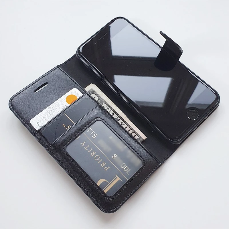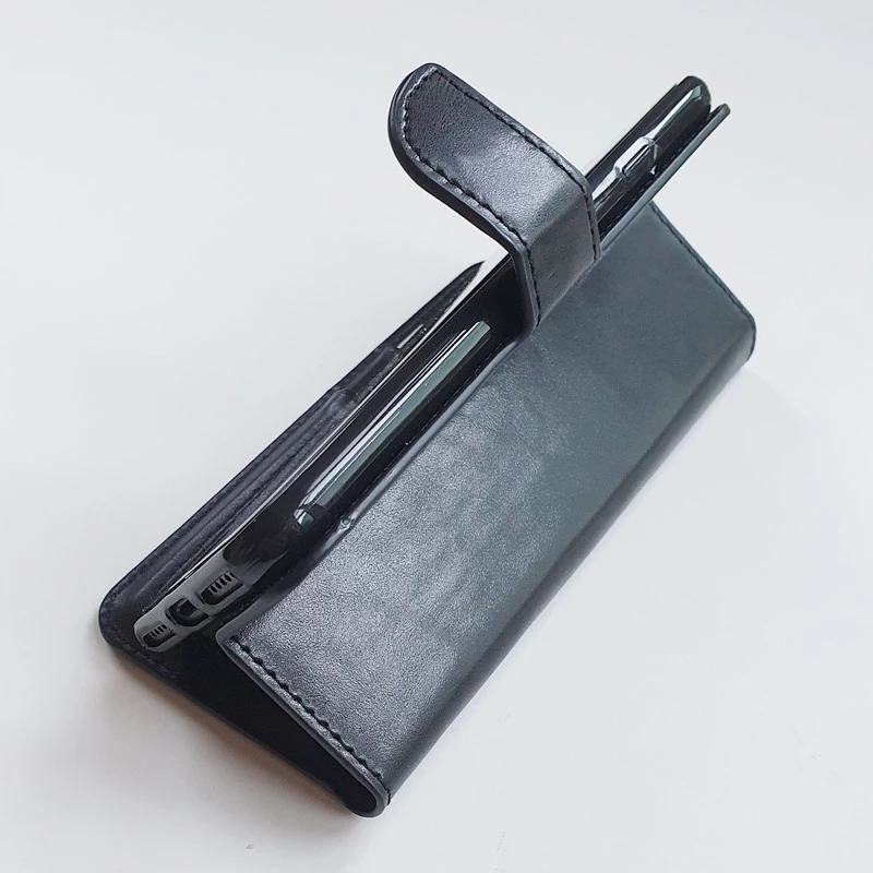 Coveret er lavet med lommer til 2 kredit kort og en lomme til sedler. Der er lavet hul til højtaleren så du kan snakke i telefonen med coveret lukket, og desuden så kan den foldes så telefonen kan stå selv som er praktisk når du skal se film eller lignende.