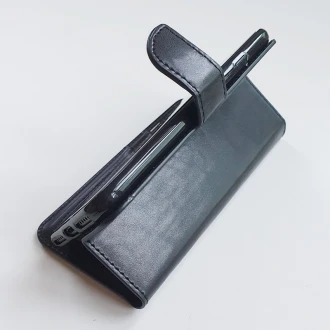 Flip cover i klassisk design som giver god beskyttelse med praktiske lommer til Samsung Galaxy J5 2017, sort Coveret er lavet med lommer til 2 kredit kort og en lomme til sedler. Der er lavet hul til højtaleren så du kan snakke i telefonen med coveret lukket, og desuden så kan den foldes så tel..
