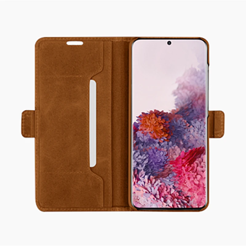 Elegant læder flip etui med kort lomme til din Samsung Galaxy S20 Plus. Meget tynd flip cover som sidder flot rundt om telefonen med et elegant stilrent look, og med en ægte split læder kvalitet i absolut top kvalitet. Der er også en flot integreret lomme som kan bruges til kredit kort eller sedl..