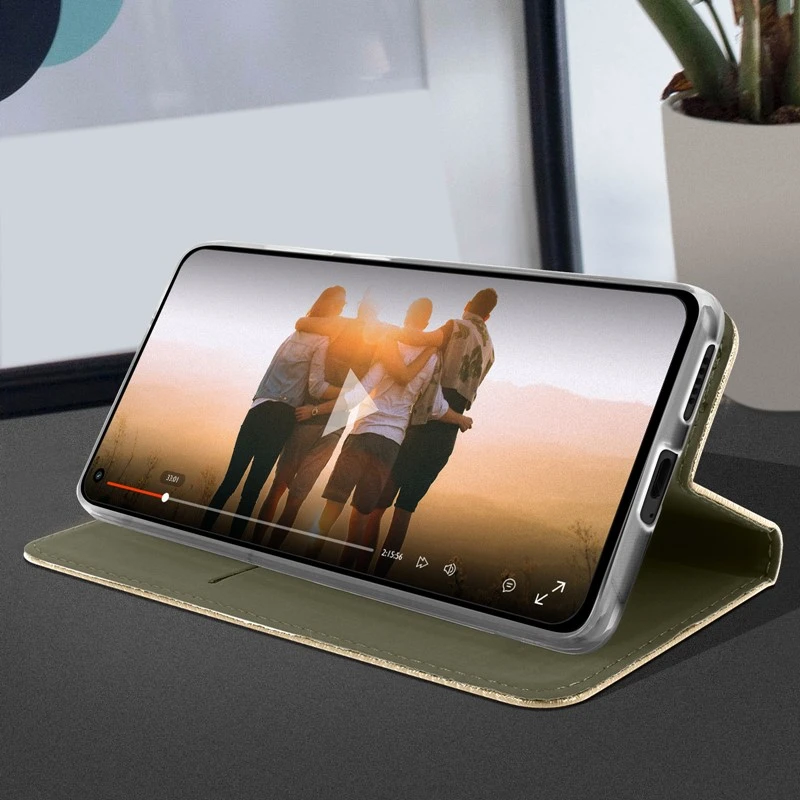 - Coveret kan foldes så telefonen kan stå selv (praktisk når du skal se film eller høre musik)